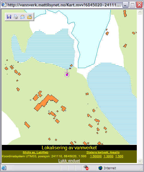 | Vis uttakssteder på kart | Vis vannverkets punkter for prøvetaking på vanlig kart. Dette kan knyttes opp mot analyseresultater og prøveplanlegging. Kontakt Miclis for nærmere informasjon. |